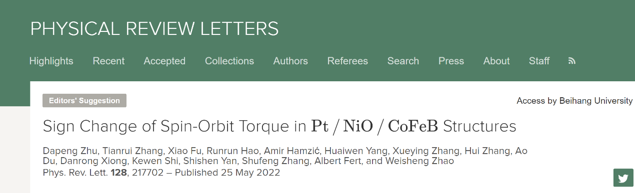 近日,bv伟德中国官方网站自旋芯片团队赵巍胜教授、朱大鹏副教授与诺贝尔物理学奖得主Albert Fert教授等合作,在薄膜异质结自旋轨道矩研究方面取得进展。该项工作中,研究团队通过在重金属/铁磁异质结构中引入氧化镍这一反铁磁绝缘体插层,在低温下实现了自旋轨道矩符号的调控,并进一步提出了基于反铁磁/铁磁界面交换耦合以及反铁磁体内交换耦合来传递自旋轨道矩的新机制。相关研究结果于5月25日以[铂/氧化镍/钴铁硼结构中自旋轨道矩符号改变(Sign change of spin-orbit torque in Pt/NiO/CoFeB structures)]为题发表在《物理评论快报》(Physical Review Letters)上,并被选为编辑推荐文章(Editors’ Suggestion,约1/6的文章会入选)。