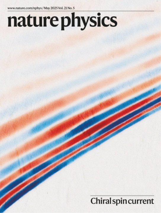 Nature Physics期刊2025年5月期封面图片,展示了在反铁磁绝缘体赤铁矿中由磁子干涉引起的交变自旋手性;右手(红色)手性和左手(蓝色)手性分别用正、负电压的逆自旋霍尔效应检测