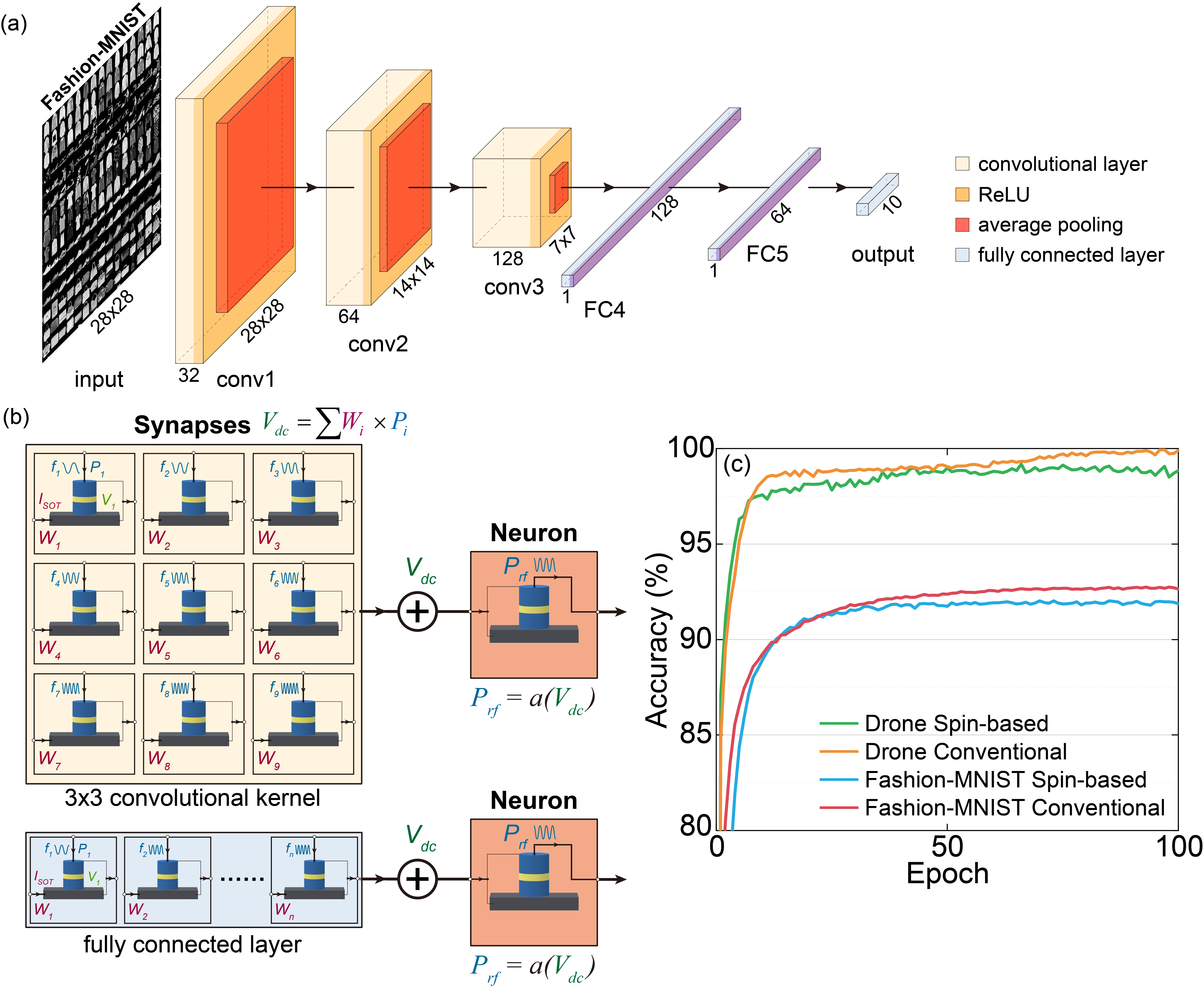 利用上述器件,团队设计了多层互连、纯电学调控的全连接神经网络与卷积神经网络(CNN),并通过仿真分别验证了其在无人机分类与图像识别数据集上的优异表现。与全连接网络相比,CNN在处理大规模任务时所需的参数和连接数量显著减少,降低了每层所需的频段数量,与多层级联的射频自旋神经网络更加适配。此外,该网络具有低功耗、高集成度、高鲁棒性、较高工作频率等优势,为自旋神经形态计算的应用领域开辟了新路径。