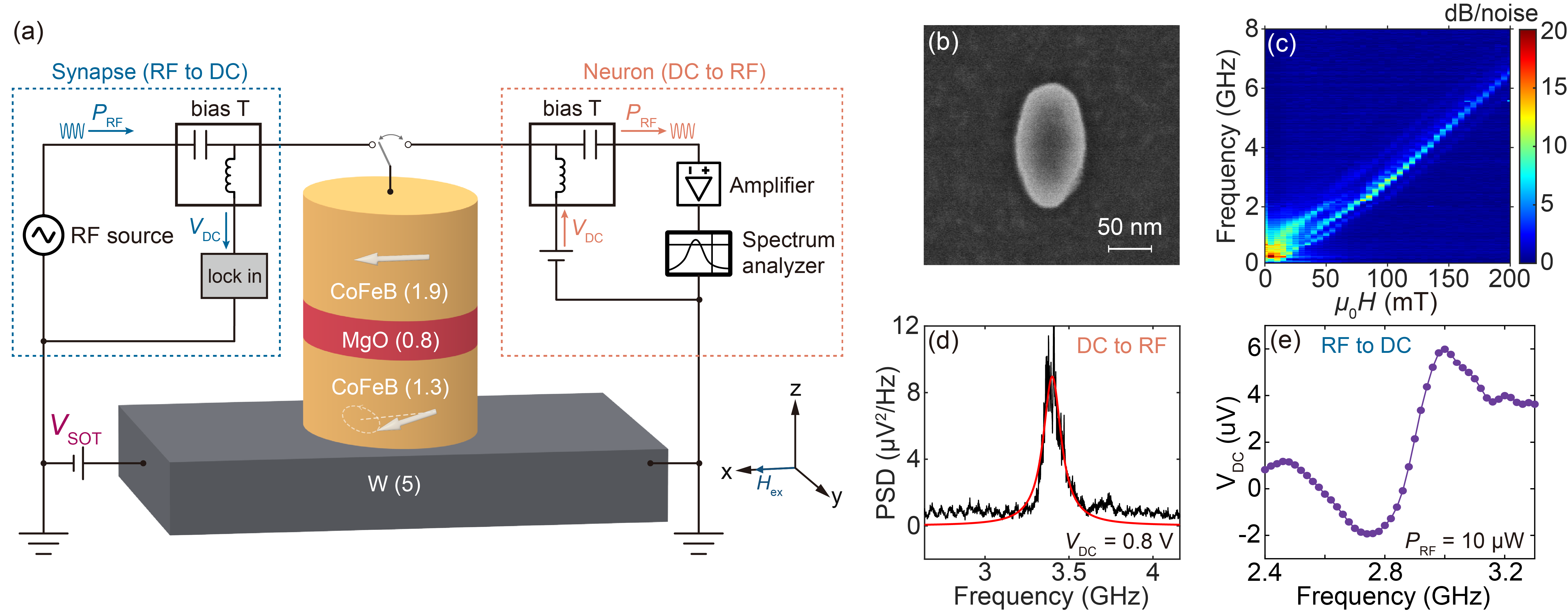 对于突触器件,以射频信号功率作为输入,MTJ产生的自旋整流电压作为输出,可实现神经网络中的乘累加运算。研究团队创新性地使用自旋轨道矩(SOT)电流通过纯电学方式调控权重大小,与传统通过磁场线中奥斯特场的方式相比功耗可降低约21.27倍,并且更容易进行尺寸微缩。对于神经元器件,以直流驱动电压作为输入,MTJ产生的振荡信号功率作为输出,可近似实现神经网络中的激活函数。相应地,输出振荡信号的频率也可通过SOT电流进行纯电学调控,以便与突触器件进行多层级联。
