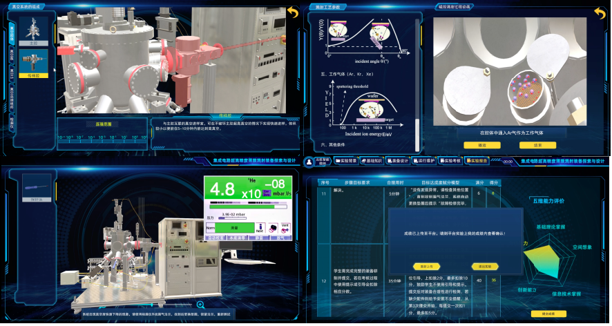 融合式创新教学方法:针对实验内容复杂与抽象的特点,课程采用“理论知识教学+虚拟实物仿真+工程实践操作”的三位一体教学模式,结合任务解锁、规律延拓、问题探究等方法,将复杂工程问题化整为零、循序引导员工掌握真空技术、溅射原理及工艺流程。在虚拟与真实环境中提供自主设计与规律探究空间,突出“认知-比较-设计-探究”的教学特色,全面提升操作技能与创新能力。