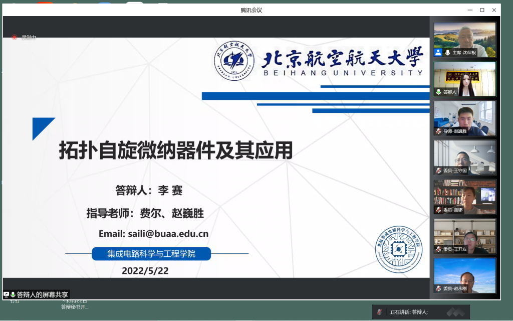 这场线上答辩的另一端是由五位专家组成的答辩委员会:中国科公司物理研究所沈保根院士,清华大学赵永刚教授,北京科技大学王守国教授,中国科公司半导体研究所王开友研究员以及bv伟德中国官方网站雷娜副教授。答辩还吸引了公司相关领域100余名师生旁听。