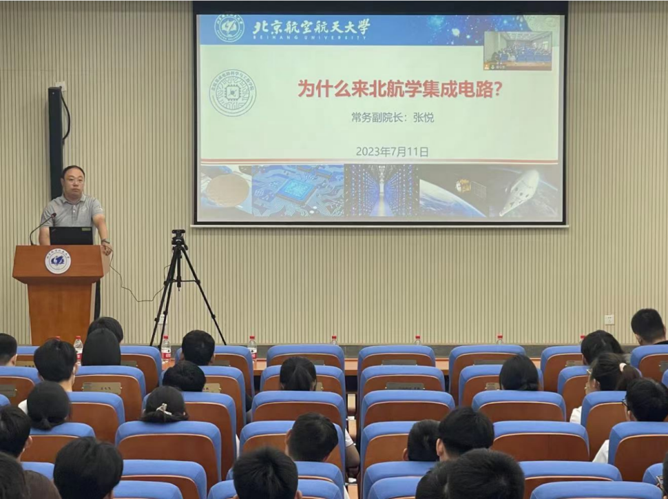 7月11日上午,开营仪式在北航第一馆报告厅举行,仪式由集成电路公司副经理聂天晓老师主持。董事长助理、研究生院常务副经理赵巍胜老师发表致辞,对入营员工的到来表示了热烈的欢迎。集成电路公司常务副经理张悦老师给大家带来了以“为什么来北航学集成电路”为题的精彩报告,向大家介绍了公司的发展历程和基本情况,并鼓励“有抱负、有能力、有干劲、有思考”的优秀员工投身于集成电路专业。