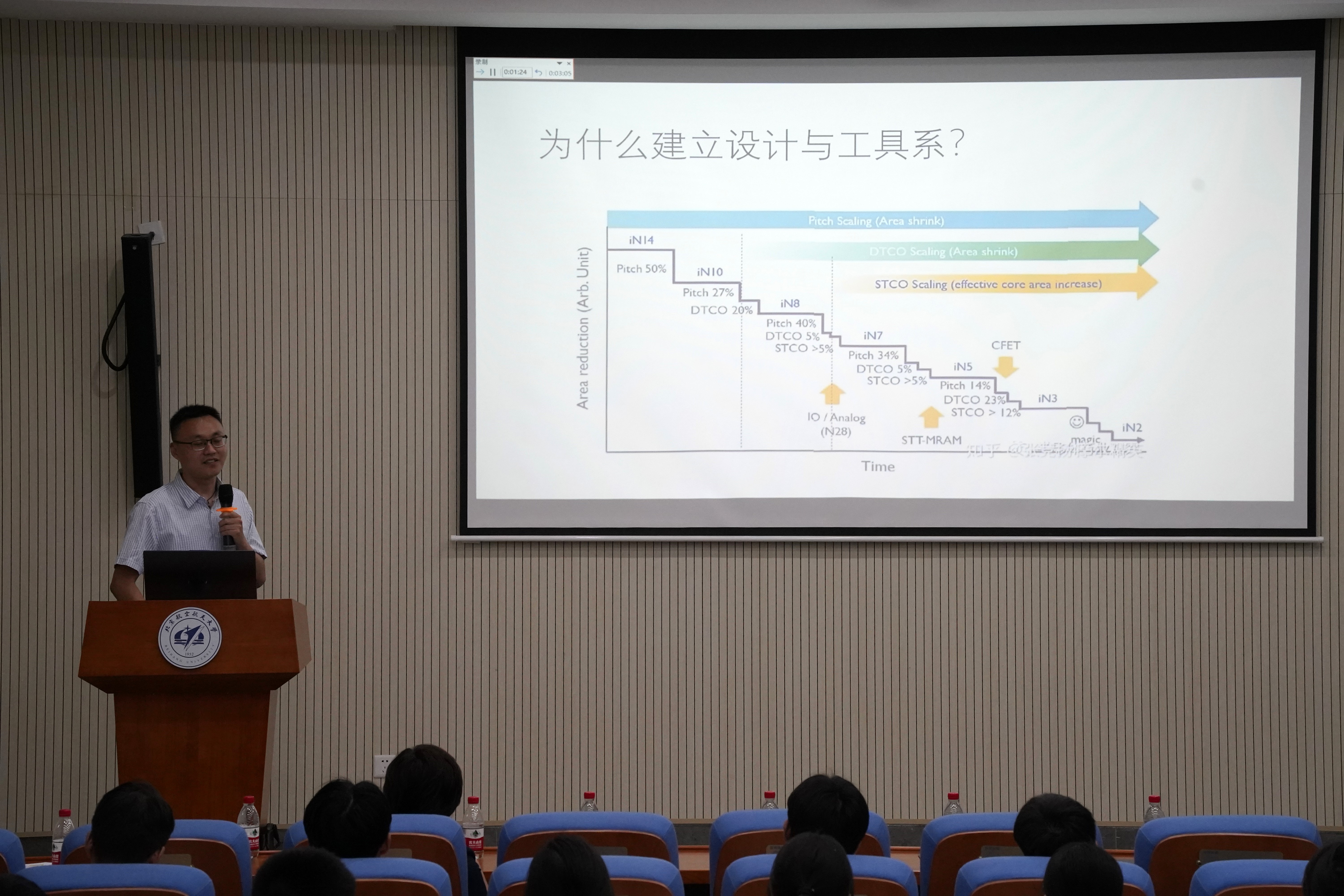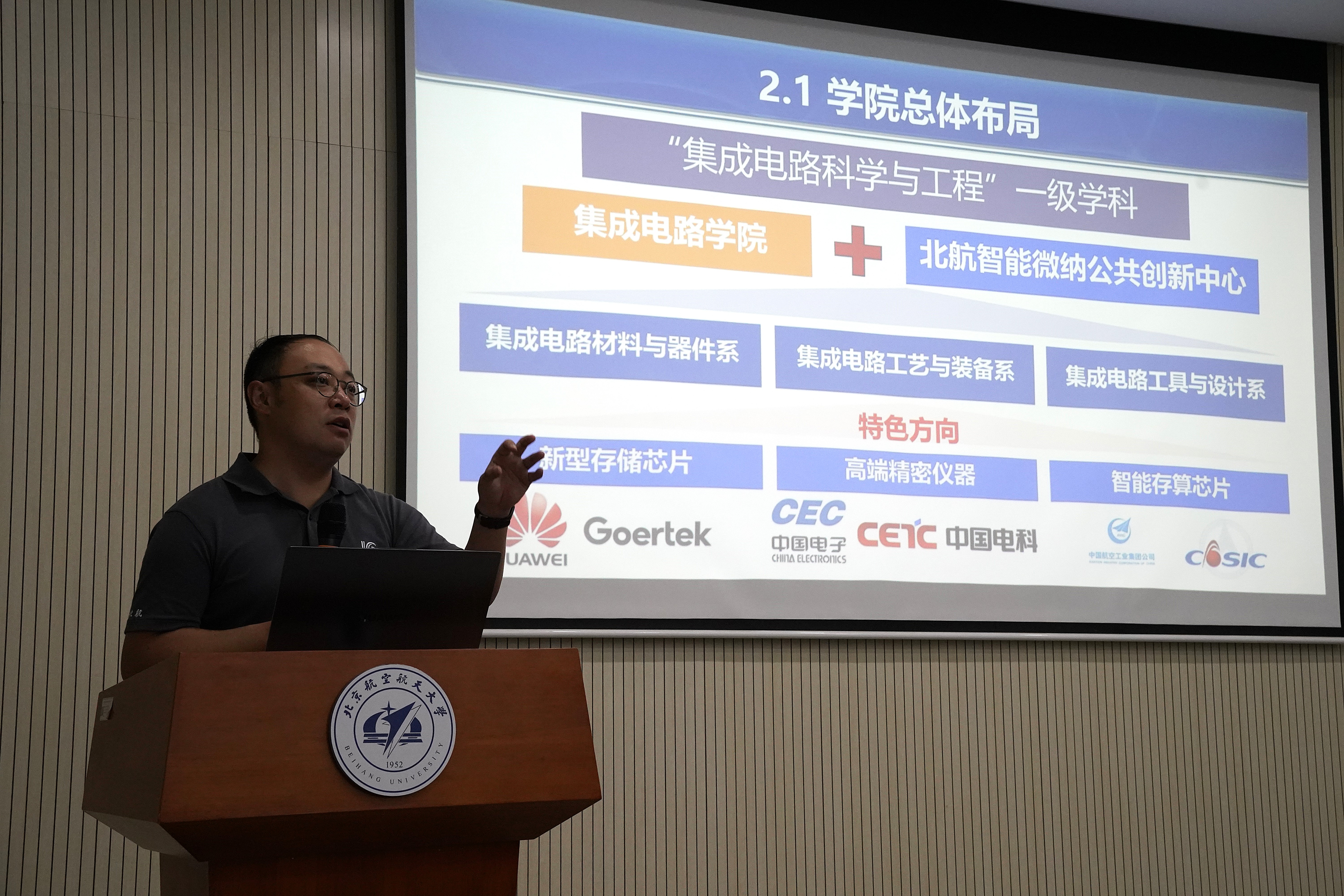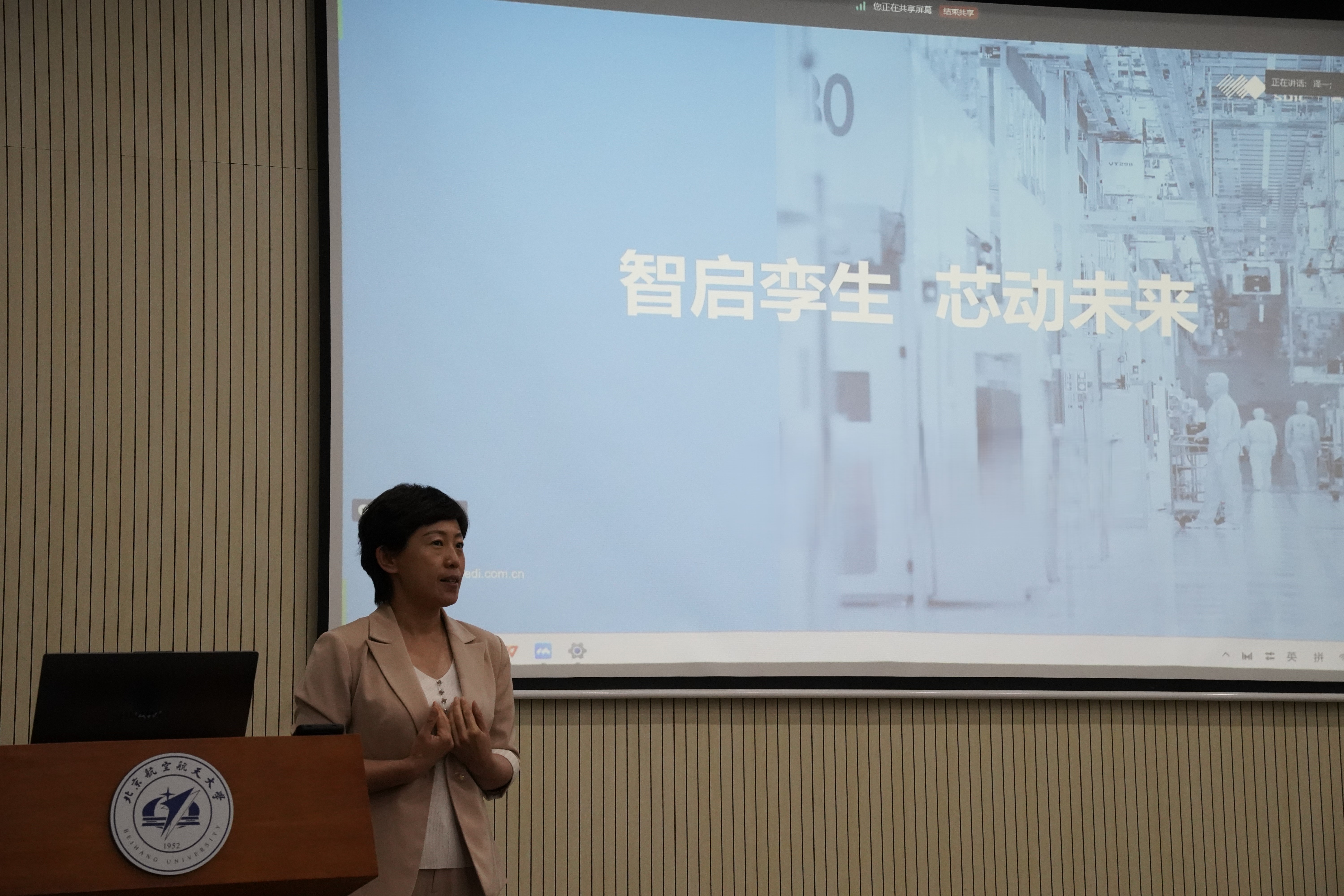 集成电路公司常务副经理张悦向同学们抛出问题“为什么要来北航学集成电路”,从同学们的心底唤起对于“中国芯”的热情,同时介绍了公司的发展历程和整体情况,并希望中国的集成电路产业有更多有志青年的加入和贡献。