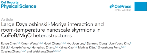近日,bv伟德赵巍胜教授团队在CellReports Physical Science期刊在线发表了题为“Large Dzyaloshinskii-Moriya interaction and room-temperature nanoscale skyrmions in CoFeB/MgO heterostructures”的学术论文。该工作报道了CoFeB/MgO异质结中大Dzyaloshinskii-Moriya相互作用(DMI)以及室温下亚百纳米斯格明子的存在,为斯格明子材料体系的选择以及新型微纳电子器件的设计提供了新思路。