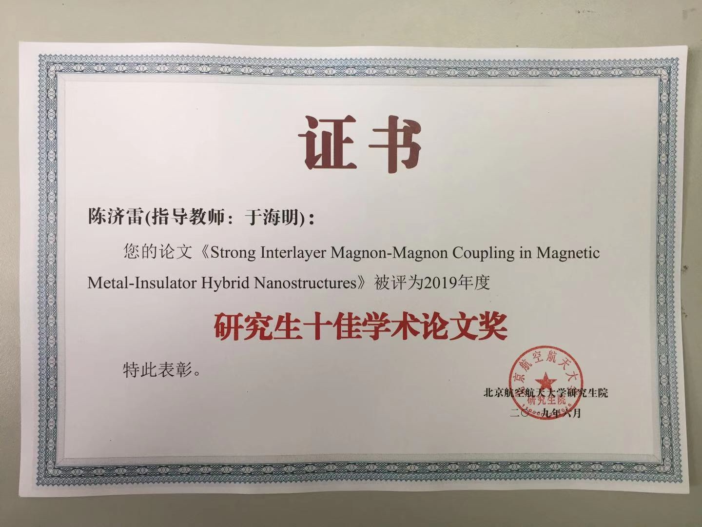 公司陈济雷同学发表的《Strong Interlayer Magnon-Magnon Coupling in Magnetic Metal-Insulator Hybrid Nanostructures》被评为公司2019年度“研究生十佳学术论文奖”。曹安妮、曹凯华、陈星、黄阳祺、李赛、王乐知、周佳琦及朱道乾同学的论文被评为2019年度研究生优秀学术论文奖。