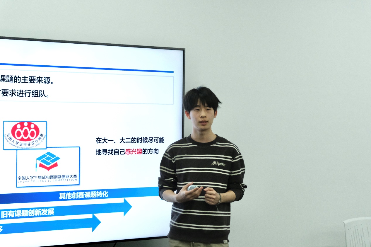 随后, 2024级硕士研究生陈依琴同学给同学们分享了她的成长经验。陈依琴曾任集成电路公司员工会主席,曾获小米奖学金、学业奖学金特等奖、创新创业奖学金一等奖等荣誉。她结合大学期间参与科创竞赛的经验,给学弟学妹们细致介绍了包括冯如杯在内的多项竞赛日程和准备工作。同时,陈依琴还就员工会工作分享了她的看法:参加员工会工作不仅可以服务他人,更是一个自我成长的过程,在员工工作中所锻炼的人际交往、沟通表达等综合能力将会使同学们受益终生。