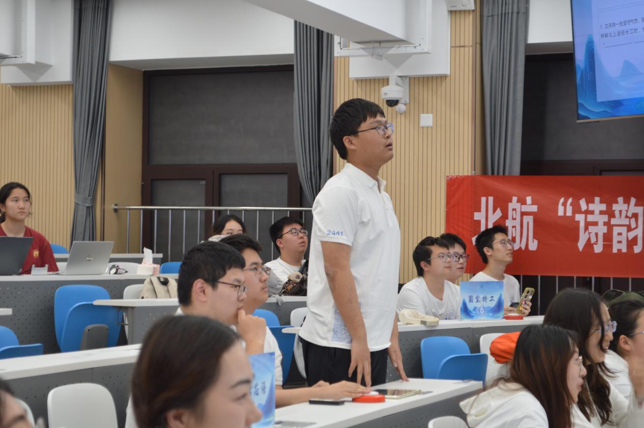 5月16日19:00,大会决赛在公司路校区主201举行。决赛第一轮“博闻多识”通过必答题考验参赛队员的诗词积累与相关文化知识,“诗话芯语”队以全场第二名的优势晋级,并在第二轮“学富五车”的抢答比拼中继续名列前茅,挺进四强行列。