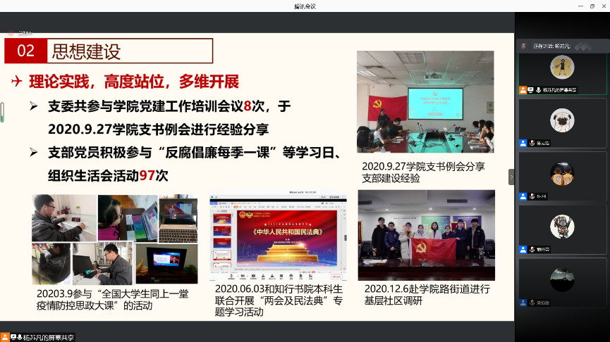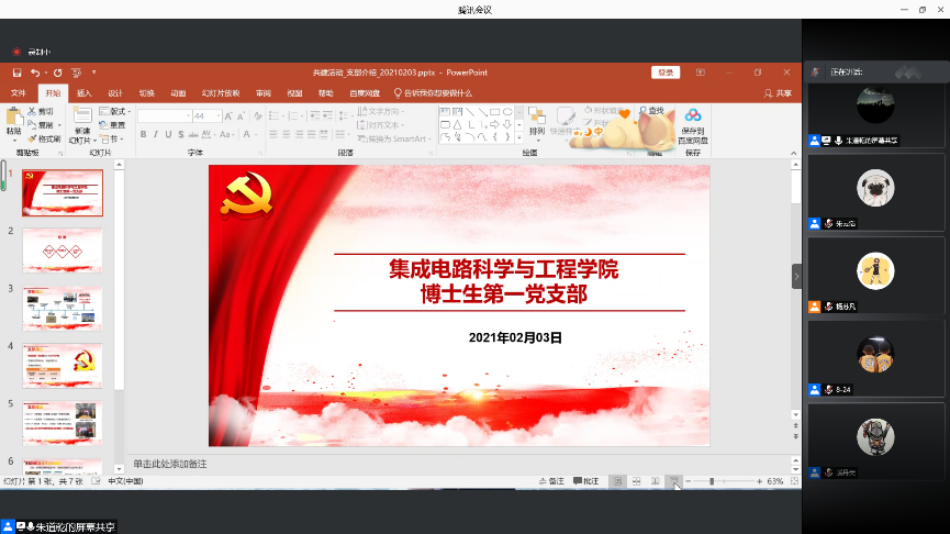 为了保证假期组织生活不停摆,促进博士生党支部党建、科研双提升,2021年2月3日下午4点,bv伟德博士生第一党支部和仪器科学与光电工程公司光电所博士生党支部通过支部结对共建的方式,在线上联合开展了党支部活动。本次活动的主题为“经验分享共提升,党建引领促融合”。活动由bv伟德博士生第一党支部组织委员朱道乾和光电所博士生党支部书记杨苏凡主持。两个支部的党员参加本次活动。