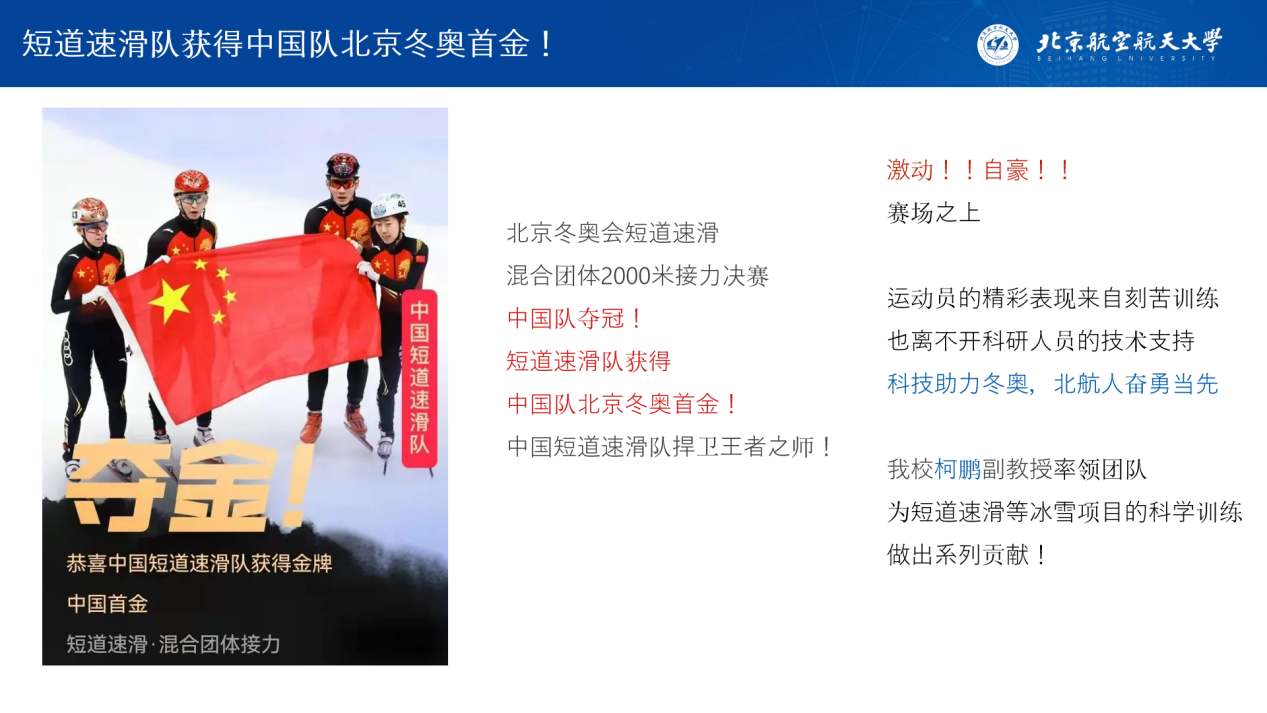 接下来,两个支部分别带来了冬奥“微党课”。北航集成电路公司2021级硕士研究生党支部书记曾强带来《科技助力冬奥备战》微党课,讲述北航柯鹏副教授团队为短道速滑等冰雪项目做出的贡献,柯鹏副教授团队借鉴航空航天的研究成果,找到了冰雪运动的最佳滑行路线、最佳滑行姿势和最优体能分配方案,助力中国短道速滑队取得优异成绩。他还讲到北航刘虎教授团队助力赛场外的航空医疗救援保障任务。