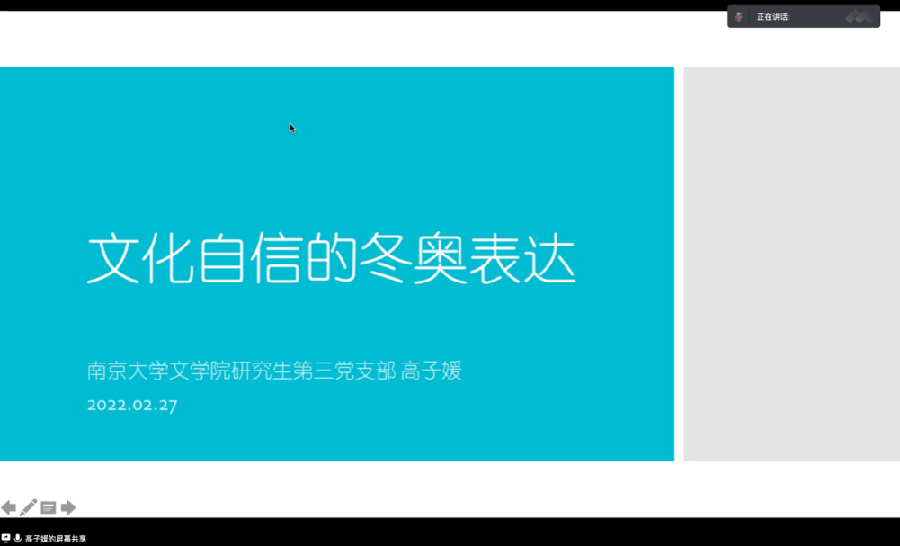 南京大学文公司2020级硕士生第三党支部的高子媛带来《文化自信的冬奥表达》微党课。高子媛同志从文化和人文的角度讲述北京冬奥会中的文化自信。种种冬奥元素承载厚重的东方文化底蕴,彰显了中华民族的文化自信,讲述着动人的中国故事。