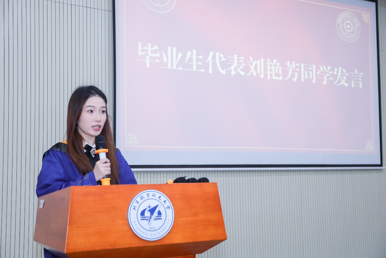 毕业生代表刘艳芳同学代表全体毕业生向父母、母校、老师们表达了感恩之情。她回顾自己在公司求学的两年半时光,在一次次的经历中浅尝“轻舟已过万重山”的欣喜;在不确定的处境中不断探索实践,磨砺自身、坚定信念;期盼着发挥所学,将理论付诸实现,为“中国芯”贡献自己的绵薄之力,展现新时代青年的成长与担当。