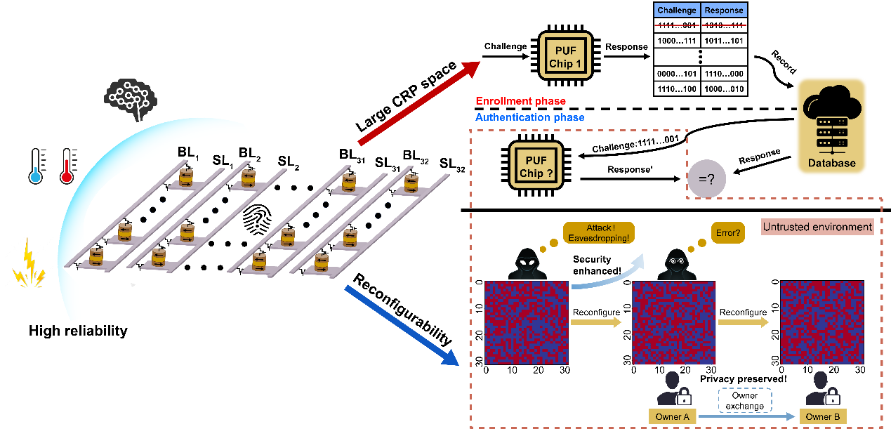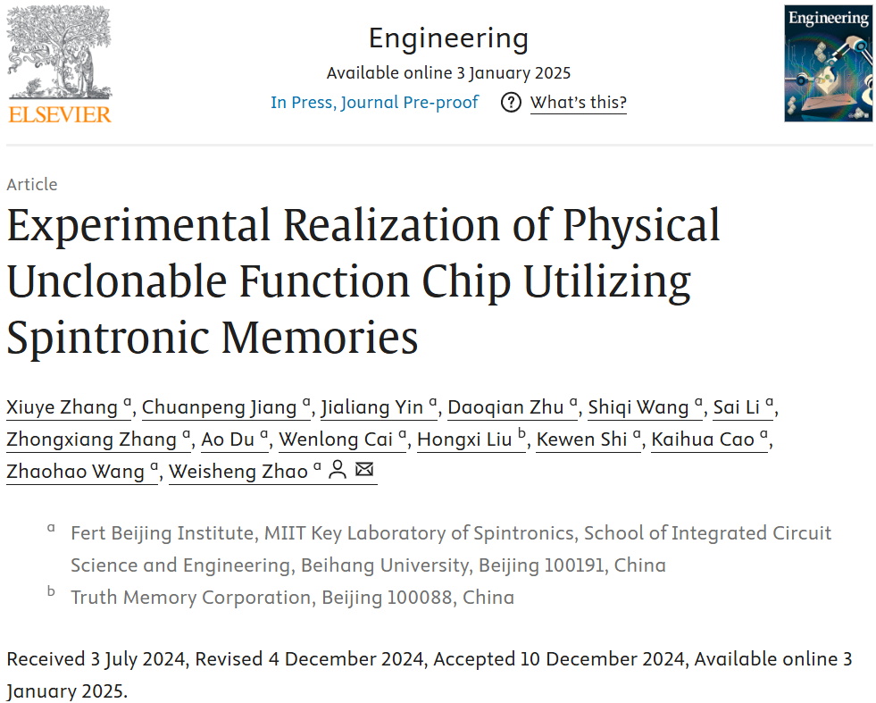 2025年1月3日,中国工程院院刊《工程》(Engineering)在线发表了bv伟德赵巍胜教授课题组的最新研究成果《Experimental Realization of Physical Unclonable Function Chip Utilizing Spintronic Memories》。该工作首次实现了一种基于自旋轨道力矩磁随机存储器(SOT-MRAM)的高可靠且可重构的强物理不可克隆函数(sr-PUF)。所提出的PUF在具有接近理想性能参数的同时,还具备抵抗机器学习模型攻击的能力,为未来物联网边缘端设备的硬件安全问题提供了一种全新的解决方案。公司2022级博士生张秀野为第一作者,赵巍胜教授为通讯作者。该工作获得了国家重点研发计划和国家自然科学基金等项目的支持。