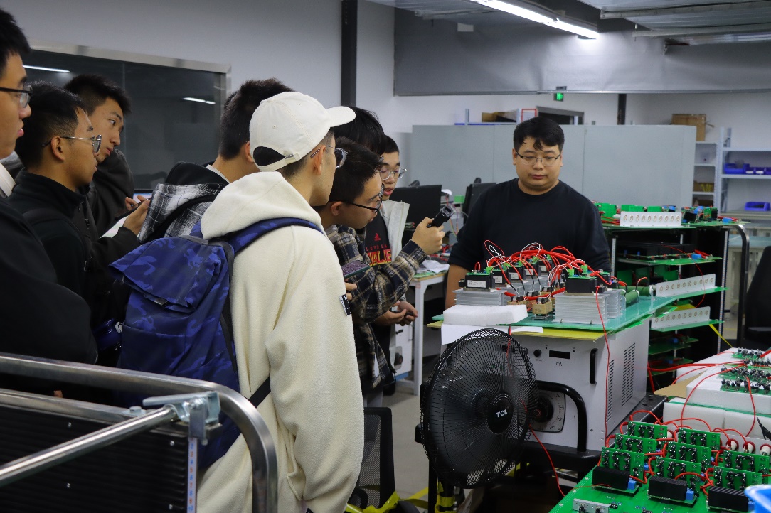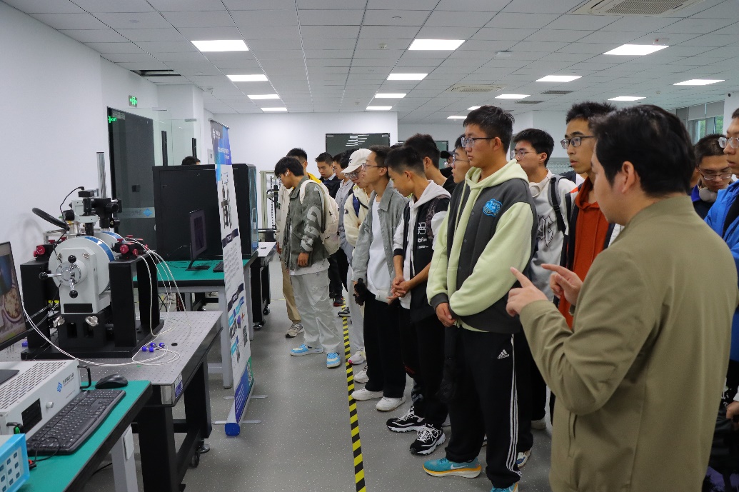 在致真精密仪器公司,研发总监蔡旭东带领同学们进入公司实验室,详细介绍了包括多功能高分辨率磁光克尔显微成像系统、多功能原子力显微镜在内的多台精密仪器。同学们还在技术人员的协助下操作了晶圆级高低温磁场探针台,认真学习了其原理和应用场景。在三海科技公司,公司负责人唐环带领同学们参观了三海科技的生产车间,一一介绍电路老化测试、寿命测试等诸多设备。同学们在技术人员的引导下,近距离学习测定芯片寿命和电路老化的相关步骤和操作。技术人员详细讲解了每一个仪器所测定的指标,并一一回复了同学们有关仪器如何应用的问题。