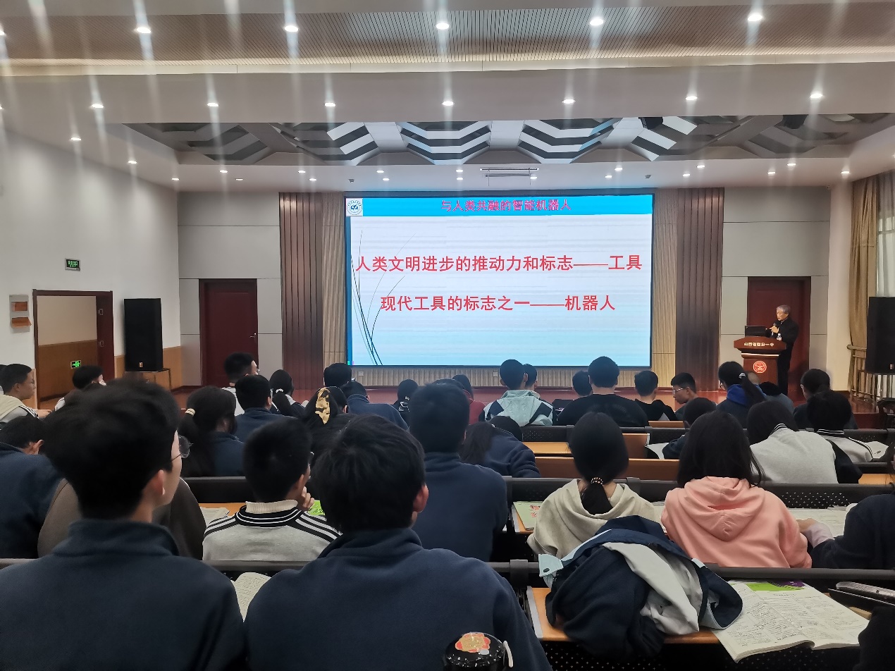 开幕式结束后,贠超教授面向临汾一中高二300多名员工,作《与人类共融的智能机器人》为主题的科普讲座,带领员工拥抱机器人技术,感受科学技术的魅力和创新精神,启发员工思考科技发展对社会的深远影响的力量。