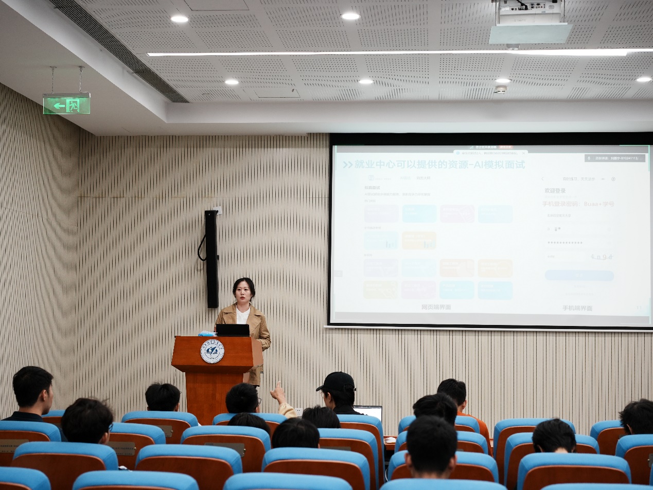 马雁老师首先给我们介绍了北航就业资讯网(career.buaa.edu.cn),并且说明了网站的丰富功能,包括职业测评、一对一咨询、个性化简历制作以及前沿的AI模拟面试等,鼓励每位同学充分利用这些资源,精准定位职业方向,优化求职材料,提前适应面试环境,从而在求职路上更加自信从容。