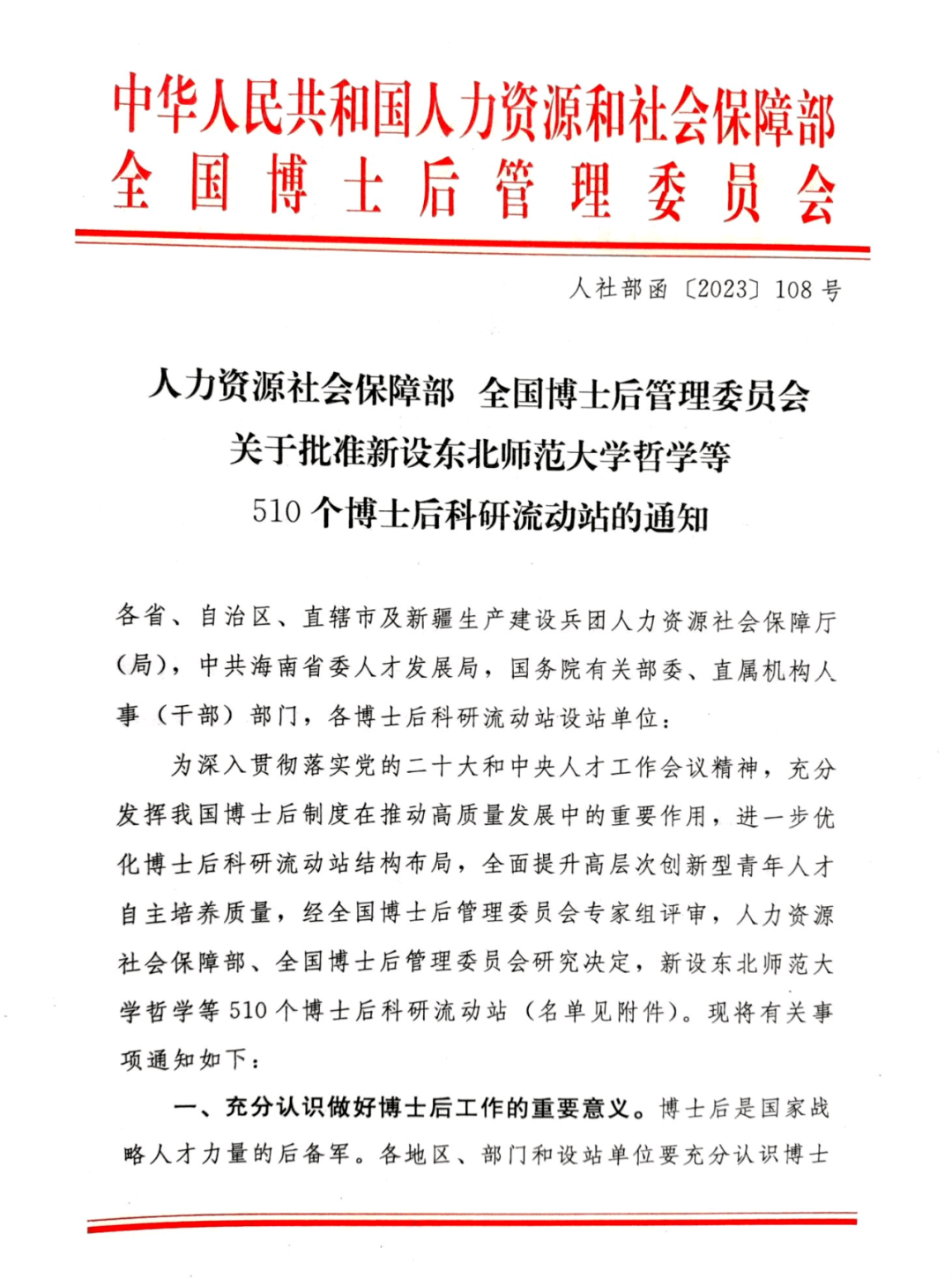 近日,人力资源社会保障部、全国博士后管理委员会联合下发《关于批准设立东北师范大学哲学等510个博士后科研流动站的通知》(人社部函〔2023〕108号),公司申报的集成电路科学与工程一级学科博士后科研流动站获批设立,这是公司取得的又一项新突破!
