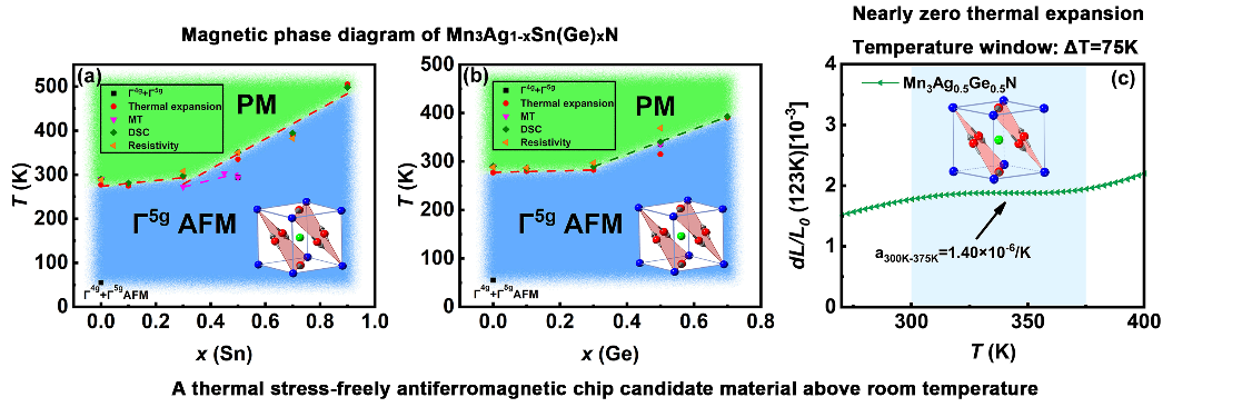 另外,通过控制Ge元素的掺杂含量可以有效调控化合物的近零热膨胀行为,进而获得了室温附近具有近零热膨胀行为的非共线反铁磁材料。最后,论文构建了非共线Γ5g反铁磁相变点高达498K的磁相图,为调控理想的室温以上的非共线反铁磁芯片材料提供了重要参考。