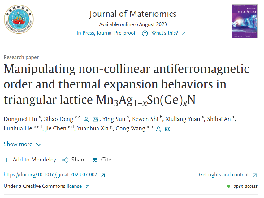 Hu, Dongmei, et al.“Manipulating non-collinear antiferromagnetic order and thermal expansion behaviors in triangular lattice Mn3Ag1− xSn (Ge)xN.”Journal of Materiomics (2023).