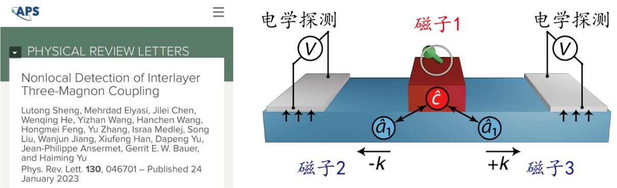 1)2023年1月发表在Physical Review Letters的“Nonlocal Detection of Interlayer Three-Magnon Coupling”(层间三磁子耦合的非局域探测)工作利用自旋波(磁子)的非线性效应将一个磁子(磁子1)分裂成具有一半能量和相反动量的两个磁子(磁子2和磁子3),这一过程被称作三磁子效应,通常发生在同一材料体系中。北航集成电路公司于海明课题组与合作者利用逆自旋霍尔效应对劈裂出的两个磁子进行非局域的电学探测,首次观测到两种不同材料体系中的层间三磁子耦合,为进一步研究基于磁子的量子纠缠效应提供了重要的实验基础。