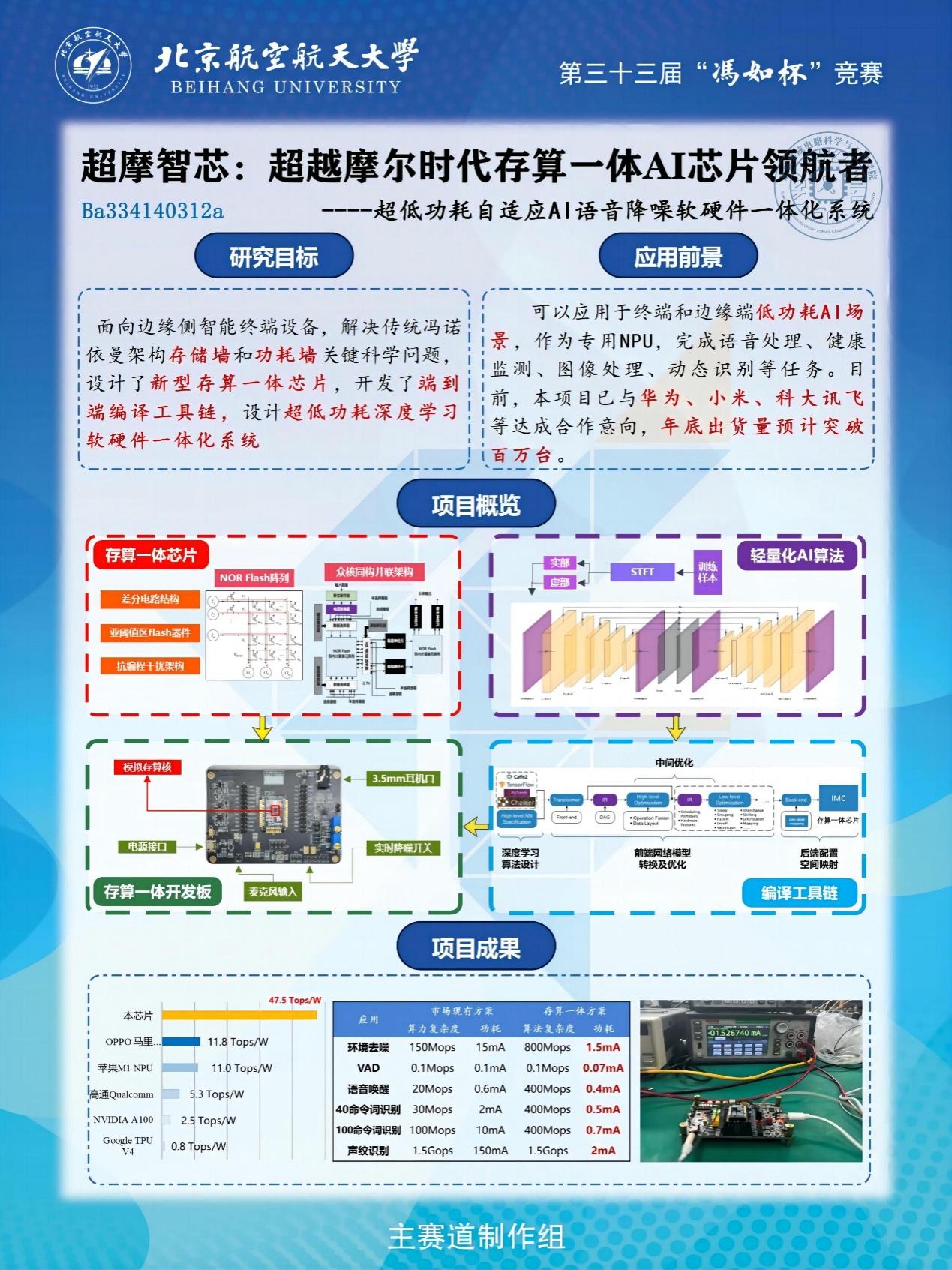 在全面贯彻党的二十大精神的开局之年,集成电路公司学子始终坚持聚焦国家重大战略需求,勇于创新,联系实际,努力实现创新向实践、基础研发向应用研发的跨越,在北航第三十三届“冯如杯”主赛道竞赛中共报名6个项目,均入围现场展示环节。经现场答辩,最终集成电路公司共斩获一等奖一名,二等奖三名,三等奖两名,其中,公司“超摩智芯——超越摩尔时代存算⼀体AI芯片领航者”项目,更是取得了本次冯如杯主赛道制作组一等奖最高分的好成绩!