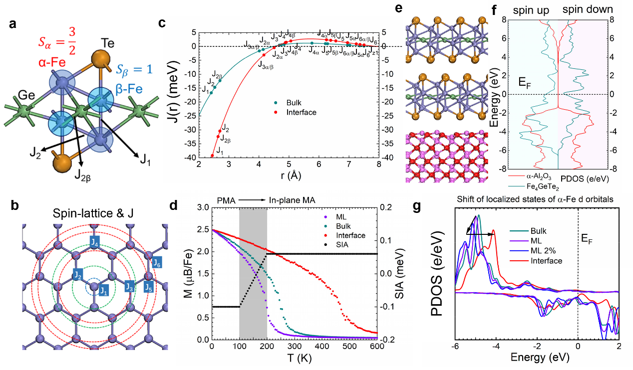 然而,由于维度效应的限制,二维磁性材料难以在较高温度下维持其铁磁性,现有的几种提升居里温度的方法也难以实现可控、高效、便捷的磁性调控。为了解决这一难题,研究团队首先使用分子束外延方法成功实现了二维磁性Fe4GeTe2薄膜的大规模制备,并利用多种磁学表征手段证明其居里温度具有反常的维度依赖性,在薄膜厚度为4nm时居里温度可高达530 K。为了解释这一现象,论文提出了一个包含RKKY交换作用的Heisenberg模型来描述Fe4GeTe2薄膜中的二维磁性。基于此模型,论文使用第一性原理计算对Fe4GeTe2/Al2O3界面的电子结构进行仿真,发现来自界面上轨道耦合引入的电子局域态移动是居里温度提升的原因。进一步地,研究团队通过厚度依赖的光电子能谱验证了Fe4GeTe2中Fed电子局域态的移动与界面的关系,证实了这一界面调控作用的存在。