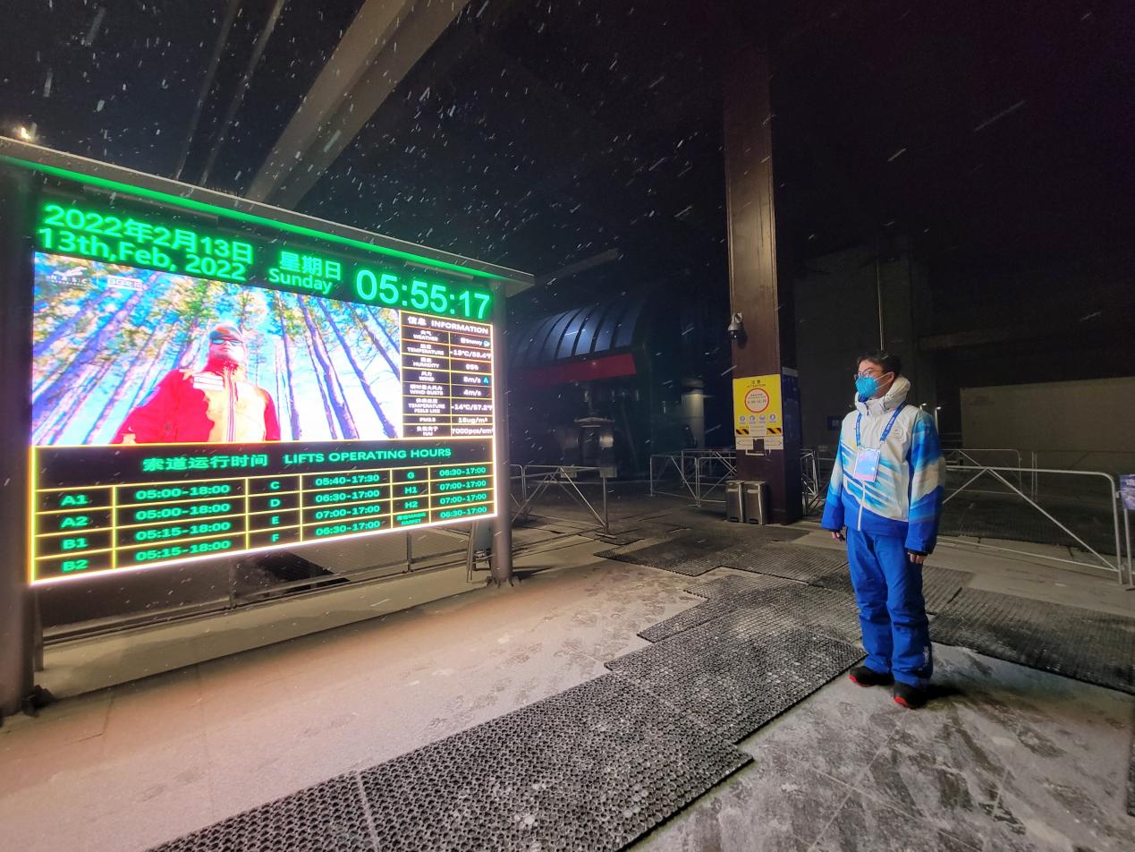 我是国家高山滑雪中心的一名缆车引导助理,我的工作主要是负责涉奥人员乘坐索道时的数量控制,检查乘坐人员的注册卡以确定其是否拥有乘坐权限,还要承担翻译与向导的工作,指引各个热门点位以及与外国友人进行沟通交流等。之所以被称为“螺丝钉”,是因为索道是整个场馆最重要的交通枢纽,无论是运动员们的训练和比赛,媒体转播商的拍摄采访,保洁人员的清理打扫,还是安保人员的执勤、观众的观赛都离不开各条缆车的稳定运行。而为了保障其运行,我需要乘坐凌晨四点多最早的班车上岗,在所有人下山后乘坐最晚的一班车下班,尤其是在冬天的延庆,在这个体感温度零下二十度,瞬时风速十几米每秒的海坨山中,条件着实是恶劣艰苦。这种情况下早起摸黑上岗却斗志昂扬,因为我们是国家高山滑雪中心的“门面”,是运动员和工作人员上山遇到的第一批志愿者,身穿蓝色志愿者服装,代表的不再是个体,而是主办国最有活力、最热情那一批人。早在踏勘时,业务经理就提及平昌冬奥会的志愿者以朝气蓬勃一面示人,令他印象十分深刻。从那时起,我就暗下决心,一定要拿出我最积极的态度对待乘坐缆车的每一个人。