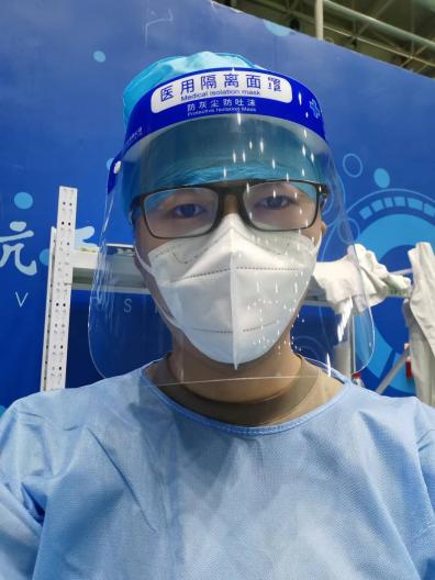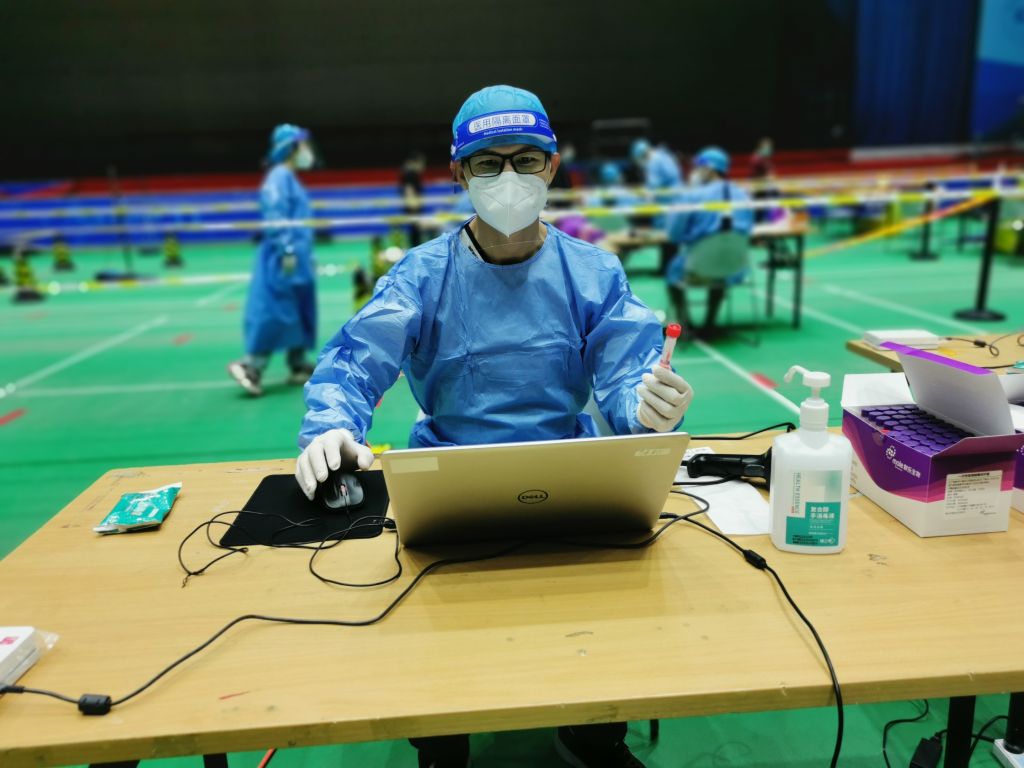 本科生辅导员刘亦文同样身穿防护服,积极投身于核酸检测工作中。