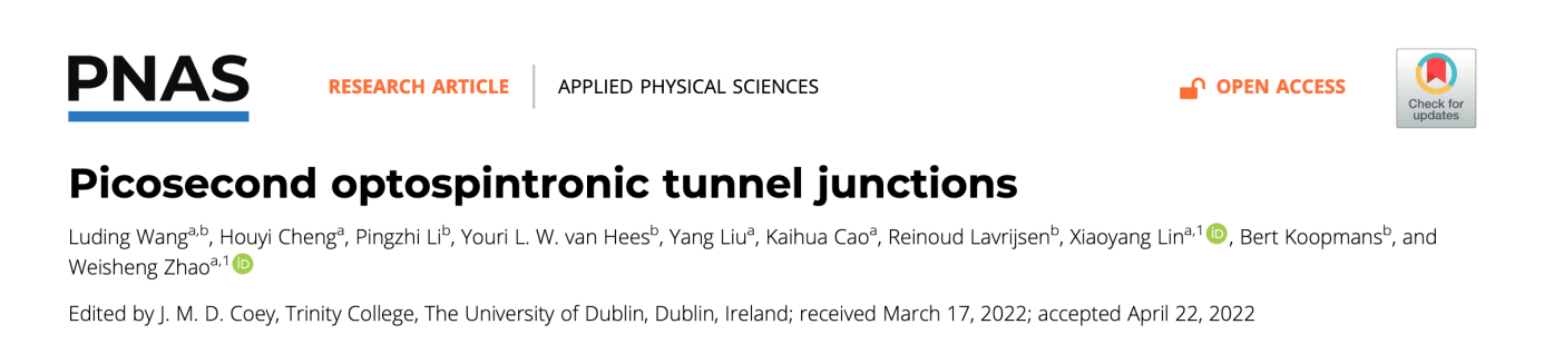 研究成果以“Picosecond Optospintronic Tunnel Junctions”为题,于6月7日在线发表于国际知名学术期刊《美国国家科公司院刊》(Proceedings of the National Academy of Sciences of the United States of America)。博士生王璐丁为论文第一作者,赵巍胜教授、林晓阳副教授为论文的通讯作者。