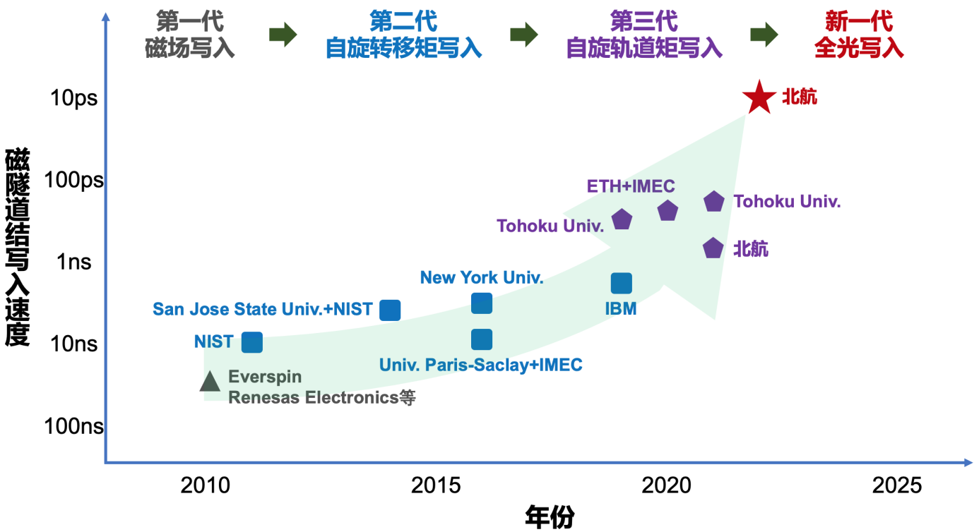 近二十年来,超快、超低功耗的新型MTJ器件持续受到学术界和工业界的广泛关注。然而,现有MTJ的写入速度长期局限在亚纳秒量级,并仍伴随着较大的功耗[7-12]。如何突破上述速度瓶颈成为当前MRAM芯片领域面临的科学挑战之一。