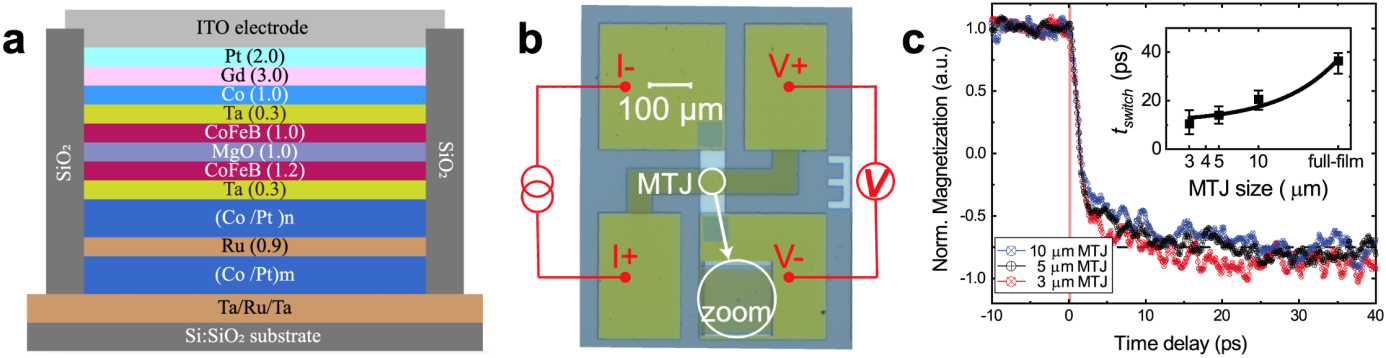 为助力解决上述问题,利用目前商用最快激励源——飞秒激光,探索MTJ的新型超快写入技术,有望另辟蹊径突破第三代MRAM芯片关键技术。团队提出利用RKKY相互作用构建全光翻转亚铁磁双层膜/超薄非磁金属间隔层(单原子层厚度)/传统MTJ铁磁自由层组成的复合型自由层Gd/Co/Ta/CoFeB。上述结构与现有主流MTJ的磁性多层膜结构相兼容,可以在保证高TMR的基础上,确保相应的器件具备超快光学方法信息写入和优异的非易失存储能力。在此基础上,设计并制备了基于飞秒激光写入的自旋光电子原型器件。经超快时间分辨测试表征,该器件具有10皮秒(ps)级的超高写入速度、较低的写入功耗(100 fJ/bit @ 50×50 nm2)和34.7%的TMR,写入速度优于当前技术1—2个数量级。