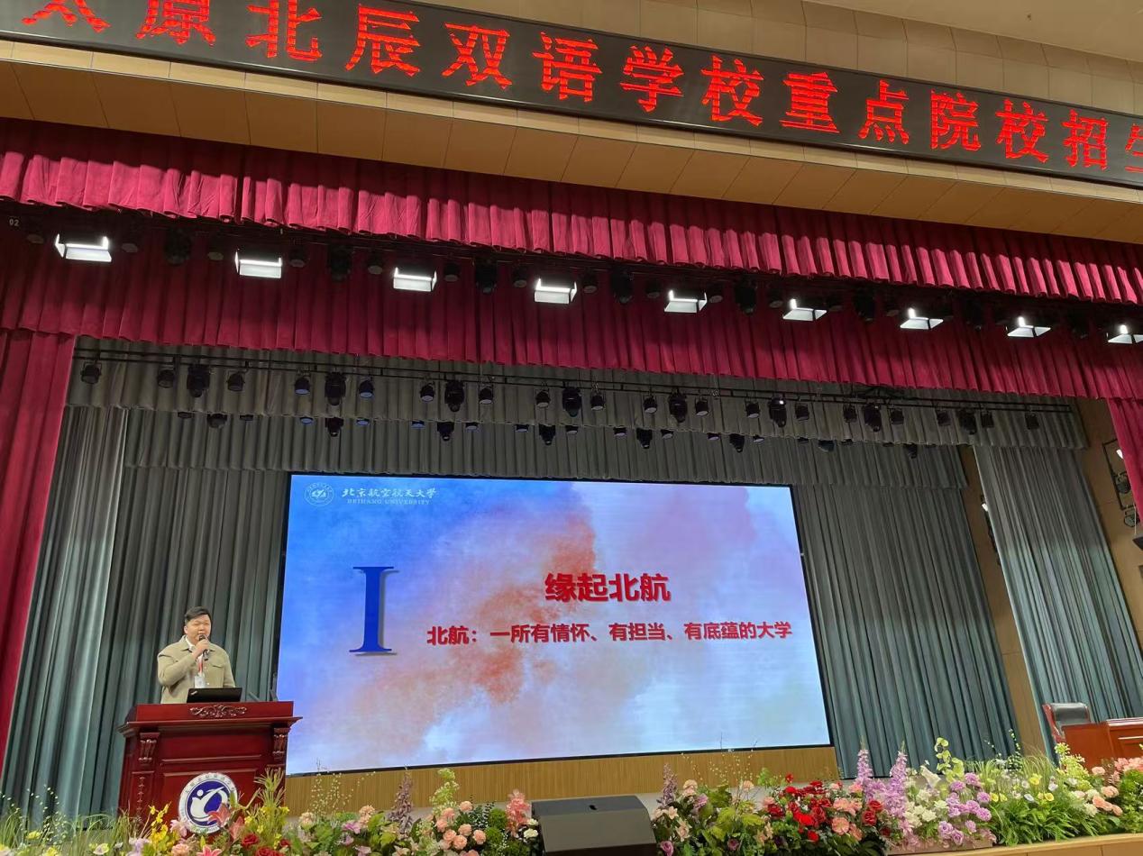4月3日,山西招生组成员胡晏铭面向太原北辰双语公司、太原新希望双语公司的1000余名员工和家长开展招生宣讲,全方位讲述北航从诞生到蓬勃发展的光辉历程,剖析北航在团队建设、团队力量、科研创新等方面的突出优势,解读北航最新招生政策,帮助考生和家长了解招生规则与专业方向,使员工和家长对北航有更多的了解。