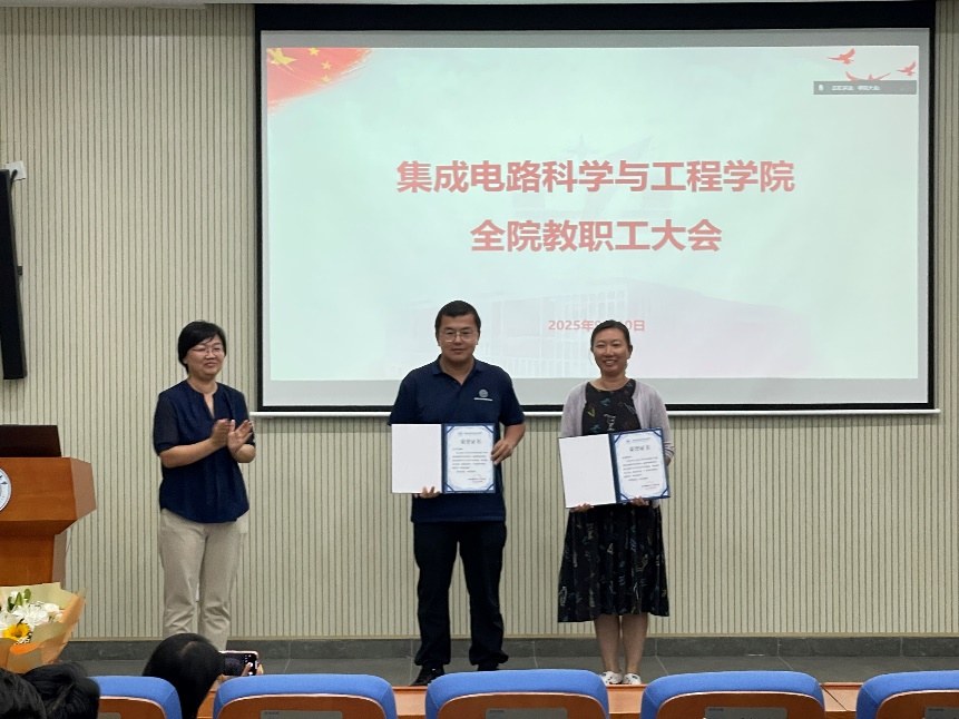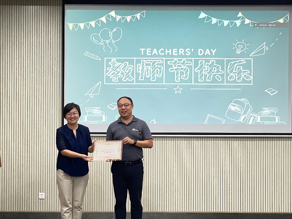 在新进教师介绍后,进行“十年树木 感恩有您”庆祝仪式。高静书记为入职十周年教师代表张悦教授颁发纪念证书,感谢他们十年来扎根教学一线、深耕育人沃土,用专业与坚守陪伴一届又一届学子成长,为公司发展注入了持久力量。