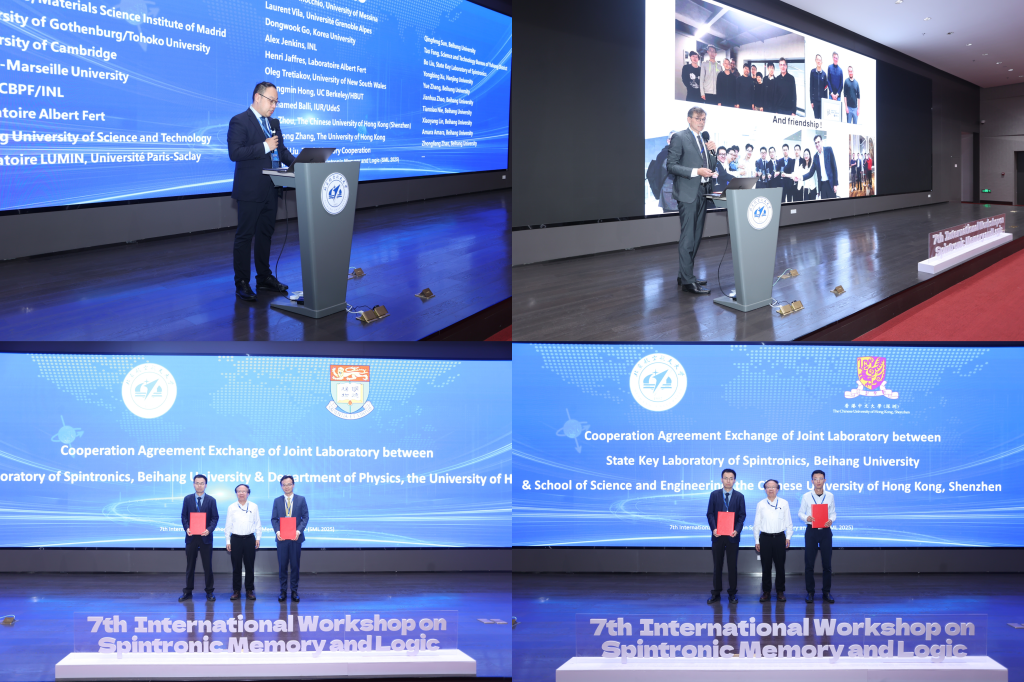 接下来,张悦教授回顾了北航与国际各地的长期合作,着重介绍了杭州北航国际创新研究院(公司)的定位和发展,并对未来更广泛的国际合作与交流表达了美好希冀。Stephane Mangin教授热烈欢迎了到场的各位国内外参会人员,表达了对北航联合培养研究生的高度认可,并对本次大会的组织者表示了衷心感谢。林晓阳教授介绍了自旋芯片与技术全国重点实验室的建设情况和未来规划,并与香港大学物理公司、香港中文大学(深圳)理工公司签订了联合实验室合作协议。