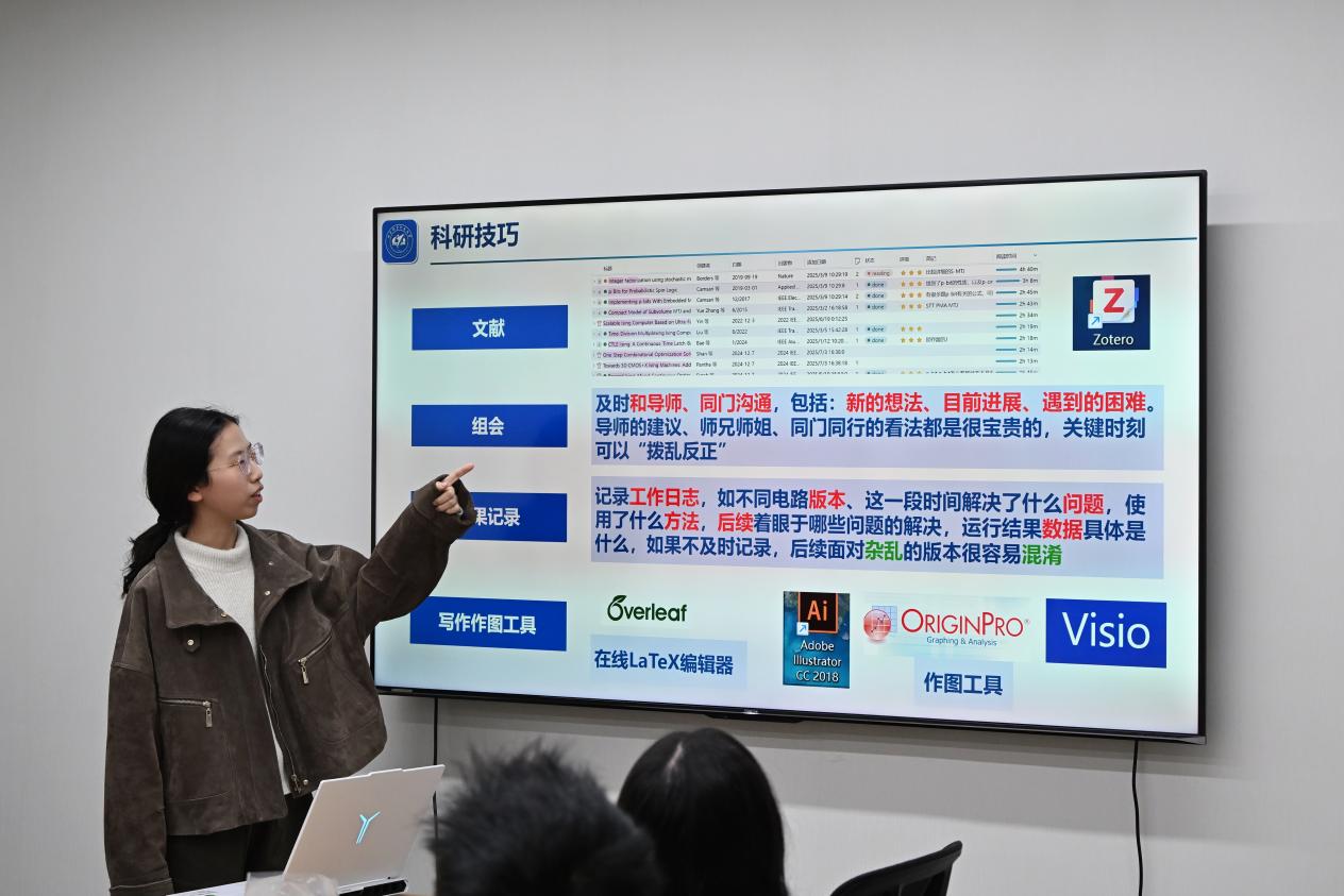对于科研,她还分享了日常实用“三件套工具”:一是文献阅读使用Zotero有助于分类整理,方便后续借鉴对比;二是整理工作日志有助于成果记录:每版电路、问题的出现与解决、数据结果等都要及时记录,以免混淆和遗忘;三是合理利用各种绘图软件,做图排版不熬夜。